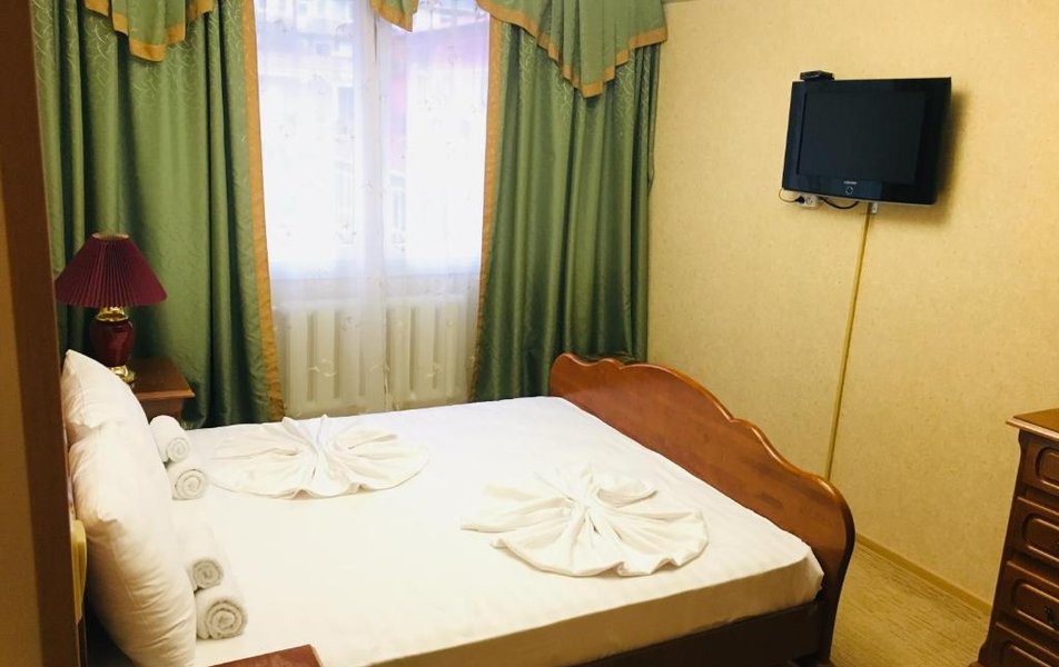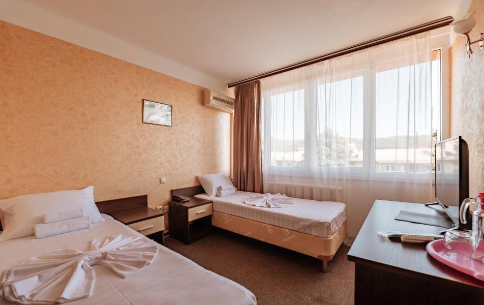 В номере: две 1,5 спальные или одна 2-ух спальная кровать, телевизор, кондиционер, холодильник, телефон, набор посуды, сейф.